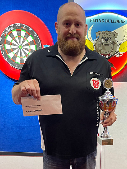 Gewinner des ersten RLT 2022-23 DANIEL SABELHAUSIm Finale standen sich dann Alt gegen Jung gegenüber! Mit Niklas Olesch (16) hatte man in dem hochklassigen und starken Teilnehmerfeld als Außenseiter rechen können, dass er es schafft, eher weniger. Aber Niklas setzte sich beeindruckend von Spiel zu Spiel mit guten Leistungen und guter Checkquote durch. Somit stand Niklas auch verdient im Finale gegen Daniel. Nikals spielte unbekümmert auf, führte 1:0 und 2:1, bevor Daniel sich wieder auf das Spiel konzentrieren konnte und sich Leg für Leg bis zum 5:2 durchkämpfte. Wie ein Champion beendete Daniel das Match mit einem HF 129 und kürte seine guten Leistungen mit dem Gewinn des RLT-Turniers